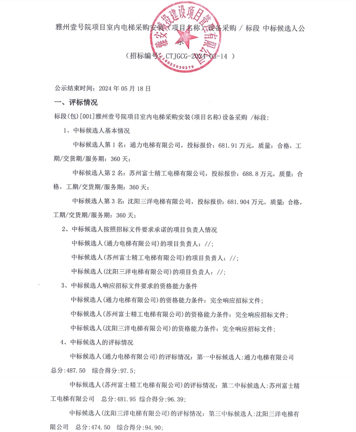 雅州壹號院項目室內(nèi)電梯采購安裝(項目名稱)設備采購/標段中標候選人公示