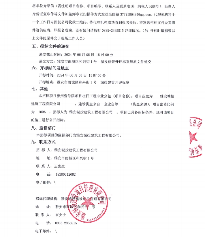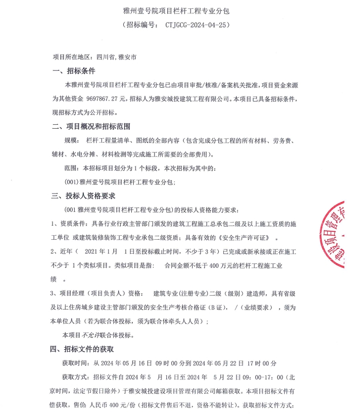雅州壹號院項目欄桿工程專業(yè)分包采購公告