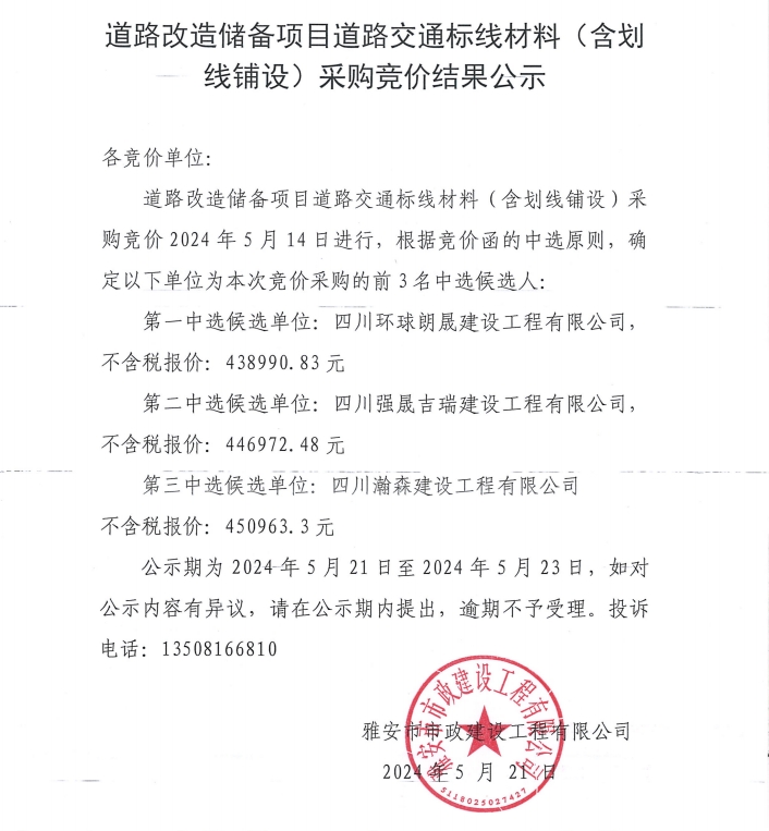 道路改造儲備項目道路交通標(biāo)線材料(含劃線鋪設(shè))采購競價結(jié)果公示