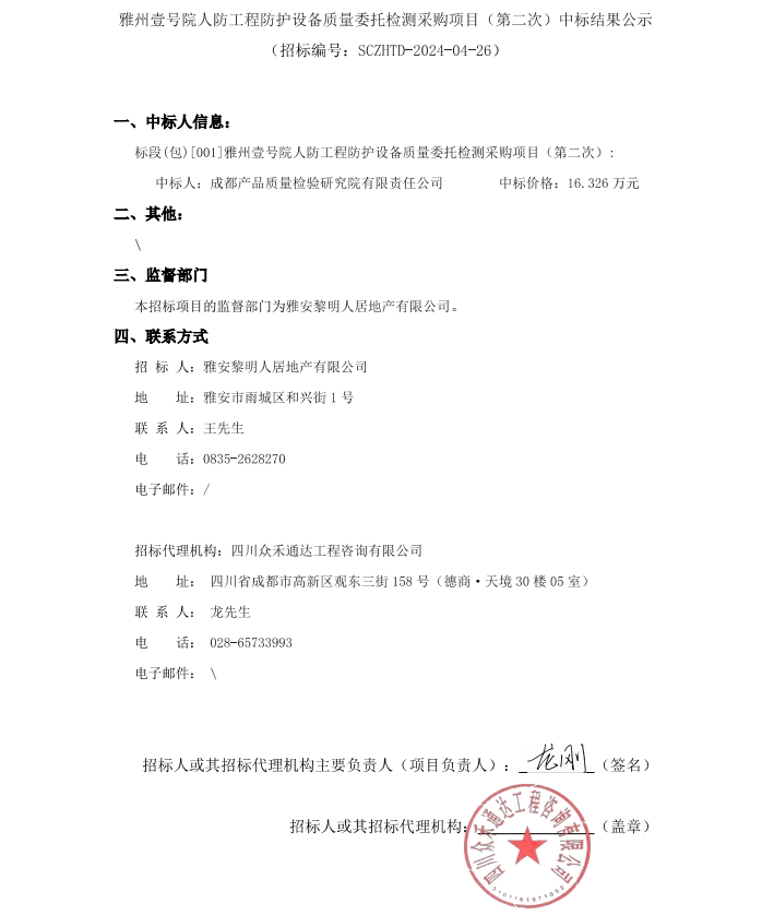 雅州壹號院人防工程防護(hù)設(shè)備質(zhì)量委托檢測采購項目(第二次)中標(biāo)結(jié)果公示