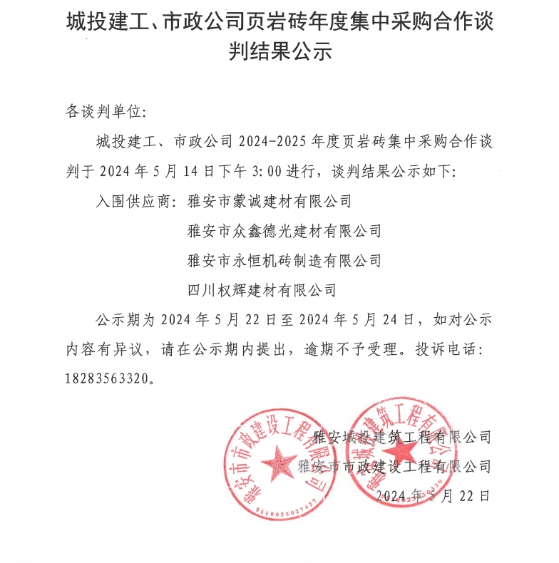 城投建工、市政公司頁(yè)巖磚年度集中采購(gòu)合作談判結(jié)果公示