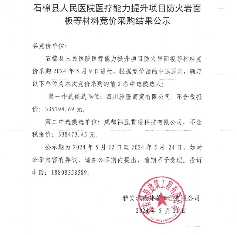 石棉縣人民醫(yī)院醫(yī)療能力提升項(xiàng)目防火巖面板等材料競價采購結(jié)果公示