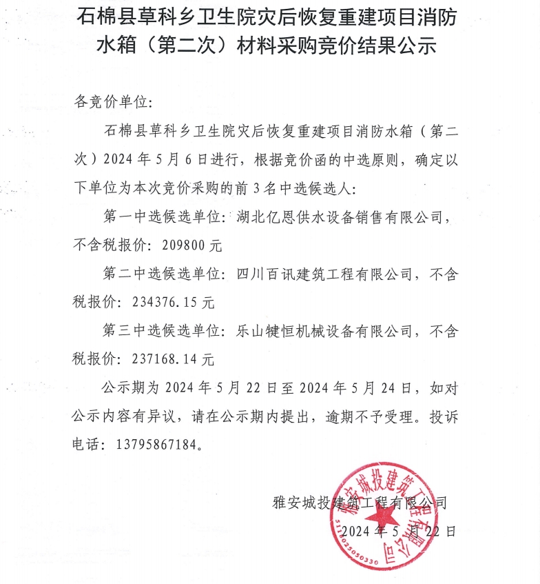 石棉縣草科鄉(xiāng)衛(wèi)生院災后恢復重建項目消防水箱(第二次)材料采購競價結果公示