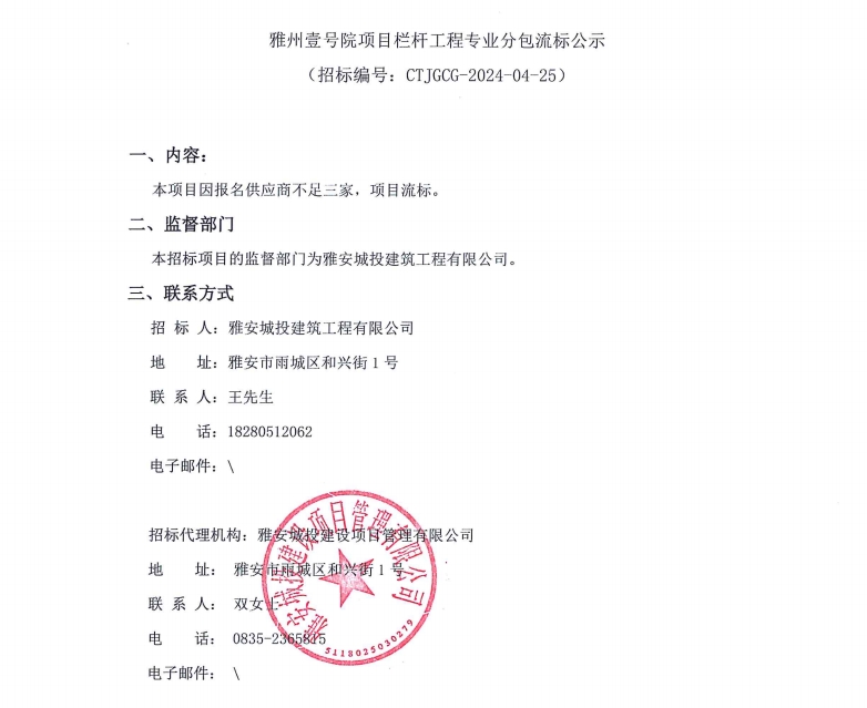 雅州壹號院項目欄桿工程專業(yè)分包流標公示