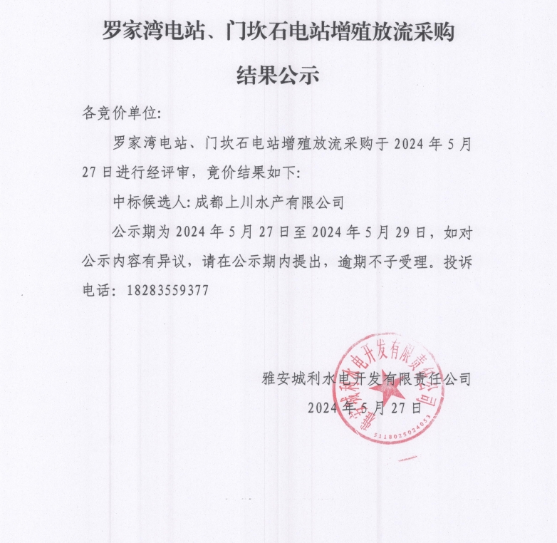 羅家灣電站、門坎石電站增殖放流采購結果公示