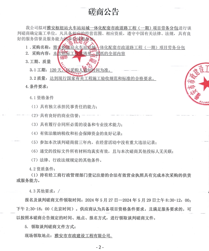 雅安樞紐站火車站站城一體化配套市政道路工程(一期)項(xiàng)目勞務(wù)分包磋商公告