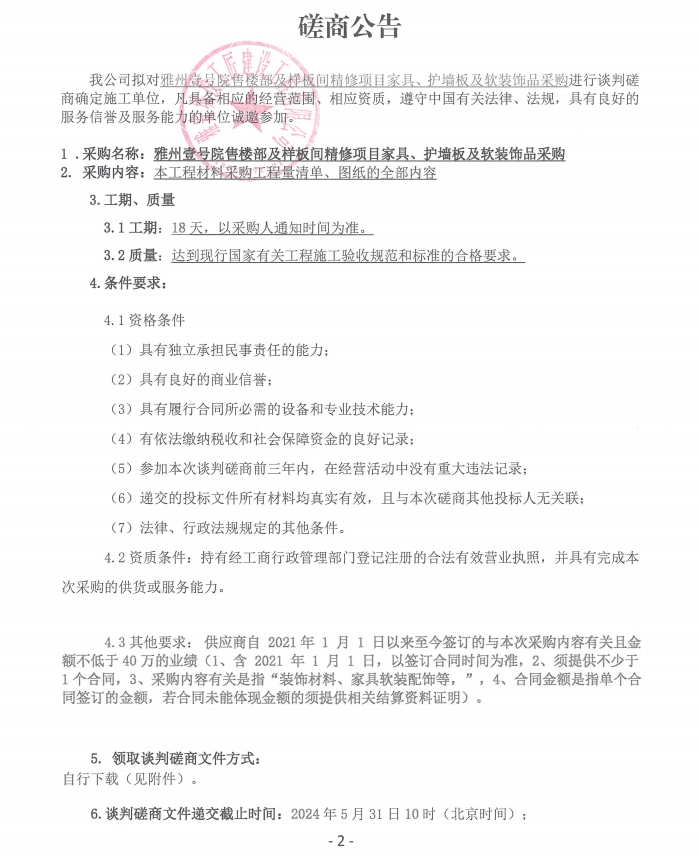 雅州壹號院售樓部及樣板間精修項目家具、護墻板及軟裝飾品采購磋商公告