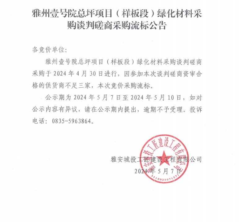 雅州壹號院總坪項(xiàng)目(樣板段)綠化材料采購談判磋商采購流標(biāo)公告