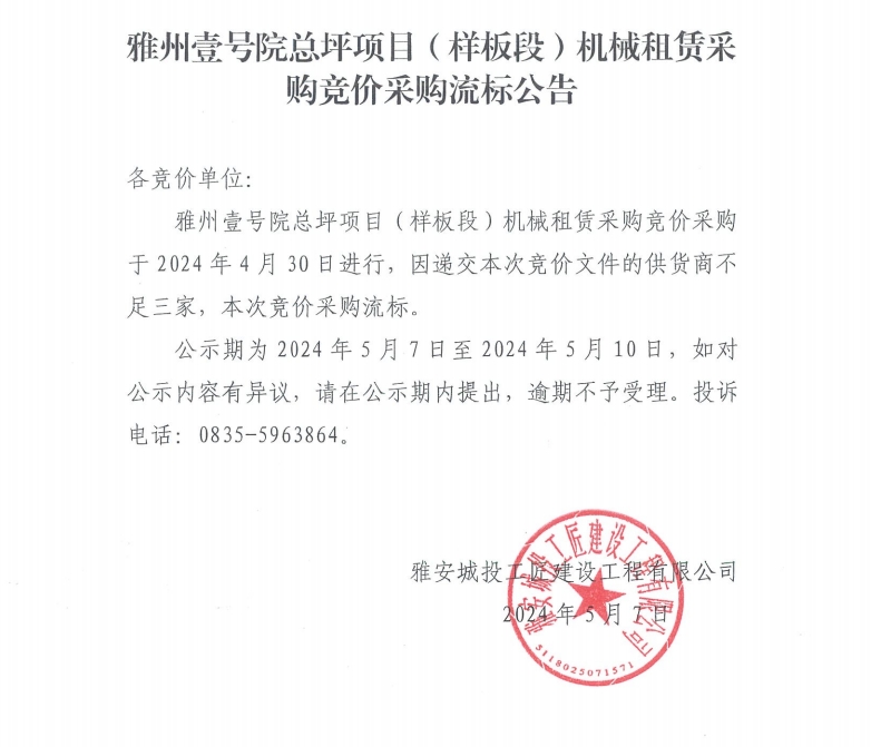 雅州壹號(hào)院總坪項(xiàng)目(樣板段)機(jī)械租賃采購(gòu)競(jìng)價(jià)采購(gòu)流標(biāo)公告