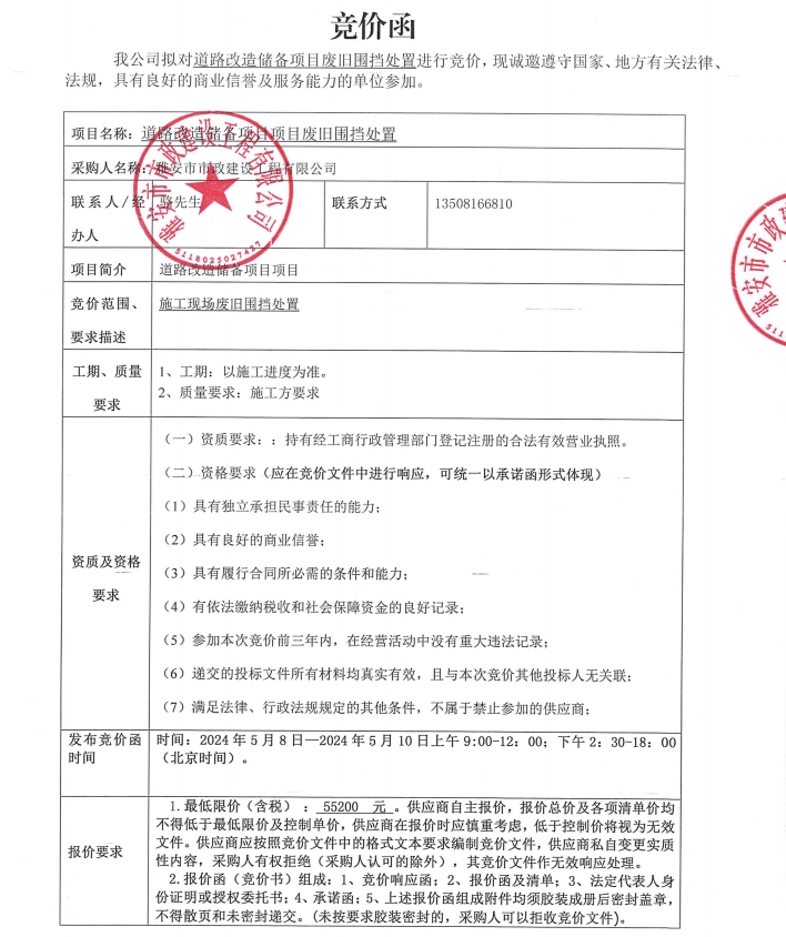 道路改造儲(chǔ)備項(xiàng)目廢舊圍擋處置競(jìng)價(jià)公告