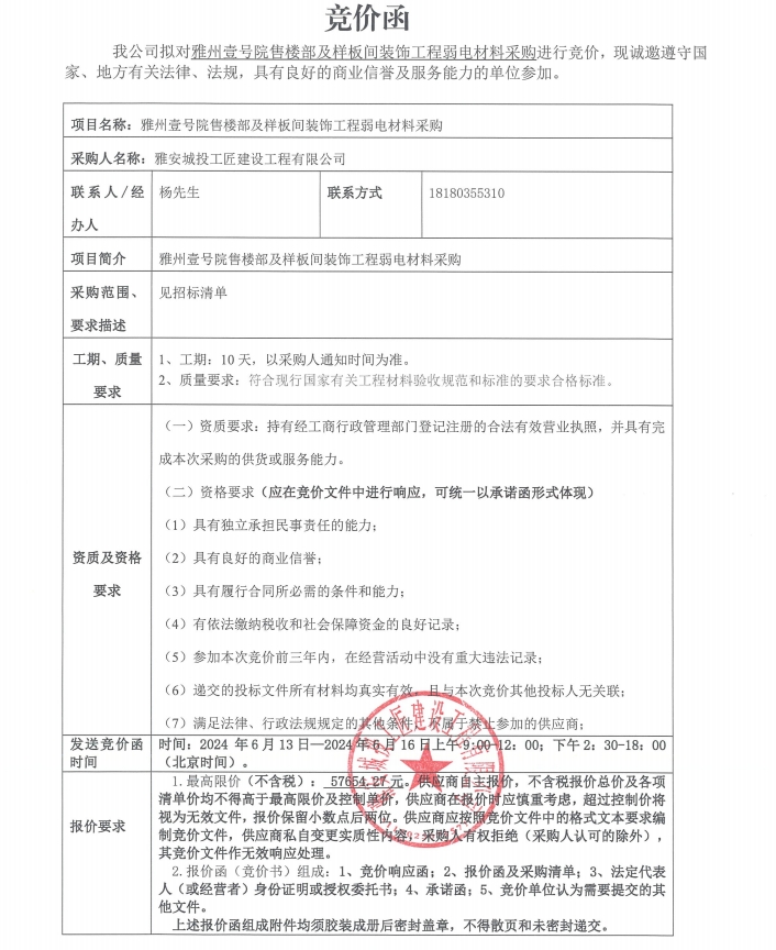 雅州壹號(hào)院售樓部及樣板間裝飾工程弱電材料采購競價(jià)公告