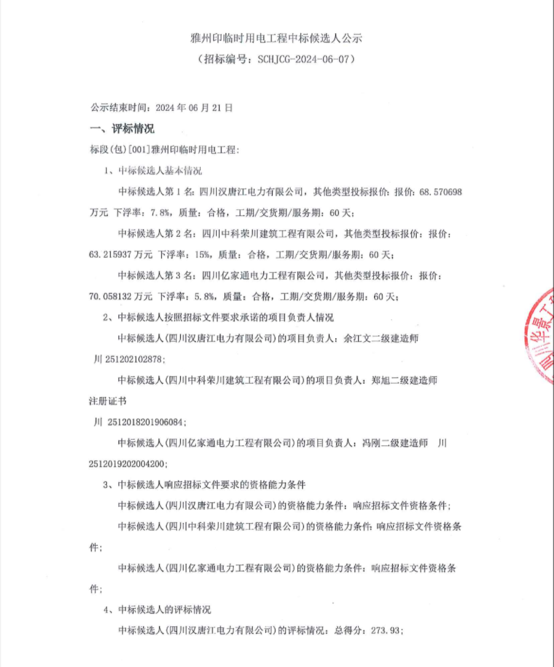 雅州印臨時(shí)用電工程中標(biāo)候選人公示