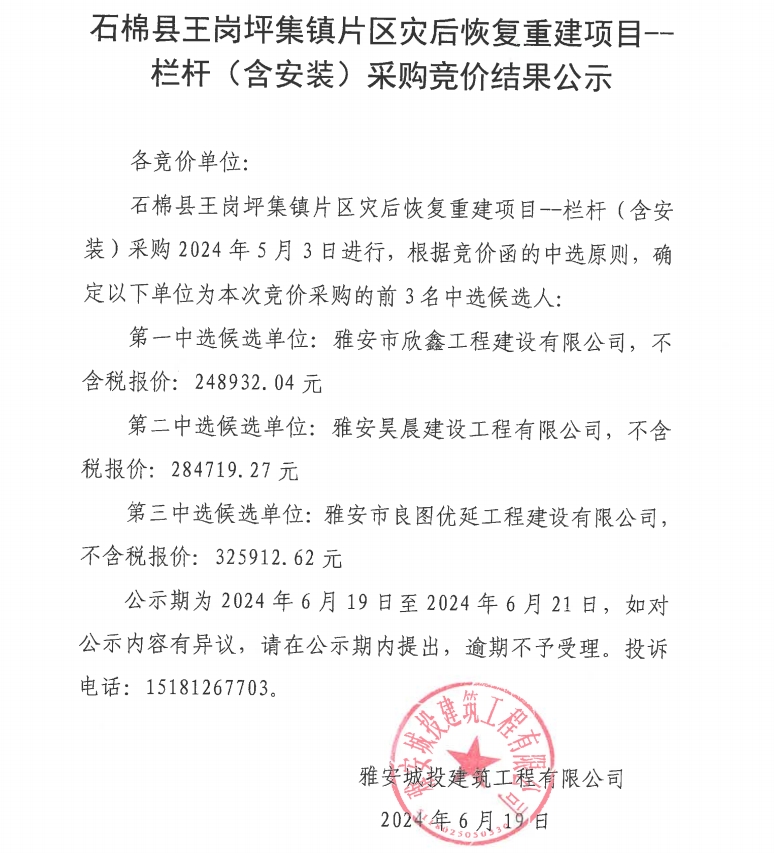 石棉縣王崗坪集鎮(zhèn)片區(qū)災(zāi)后恢復(fù)重建項(xiàng)目--欄桿(含安裝)采購競價(jià)結(jié)果公示