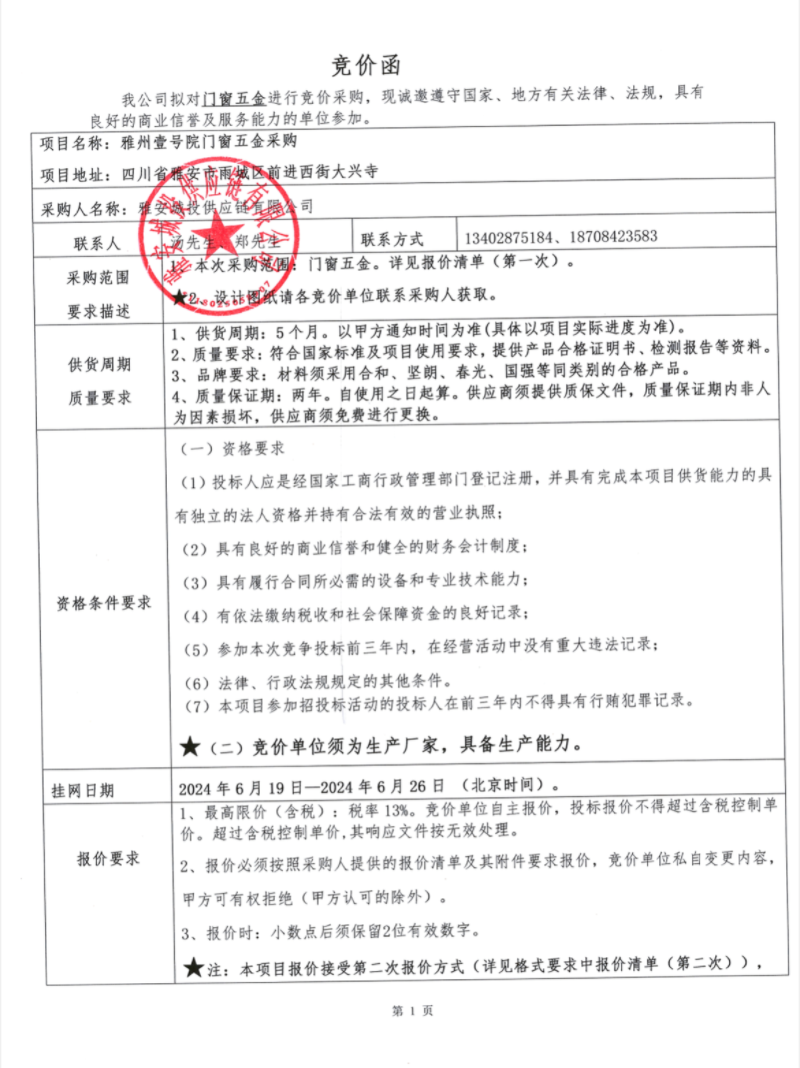 附件1:競(jìng)價(jià)函--雅州壹號(hào)院門窗五金采購