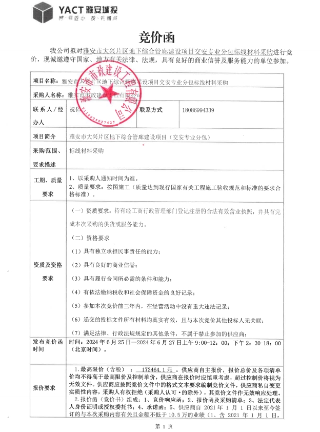 雅安市大興片區(qū)地下綜合管廊建設(shè)項(xiàng)目交安專業(yè)分包標(biāo)線材料采購競價(jià)公告
