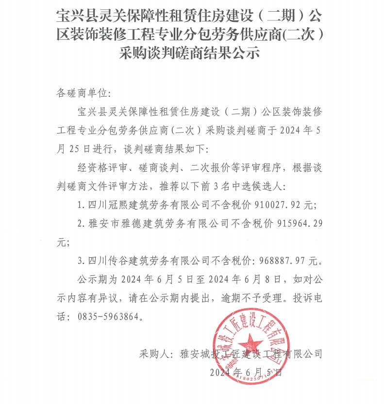寶興縣靈關(guān)保障性租賃住房建設(shè)(二期)公區(qū)裝飾裝修工程專業(yè)分包勞務(wù)供應(yīng)商(二次)采購(gòu)談判磋商結(jié)果公示