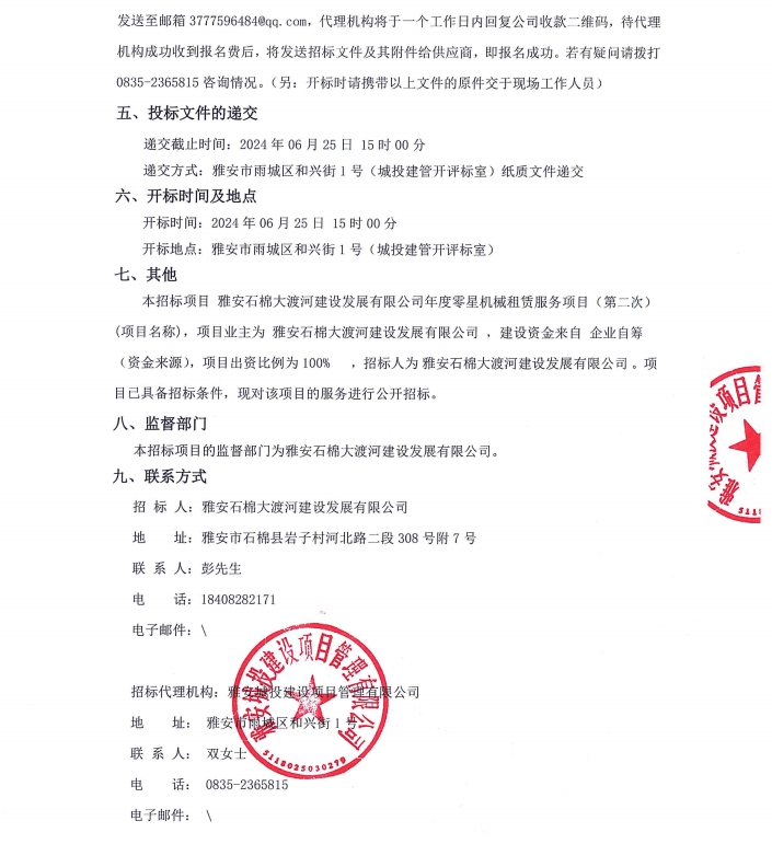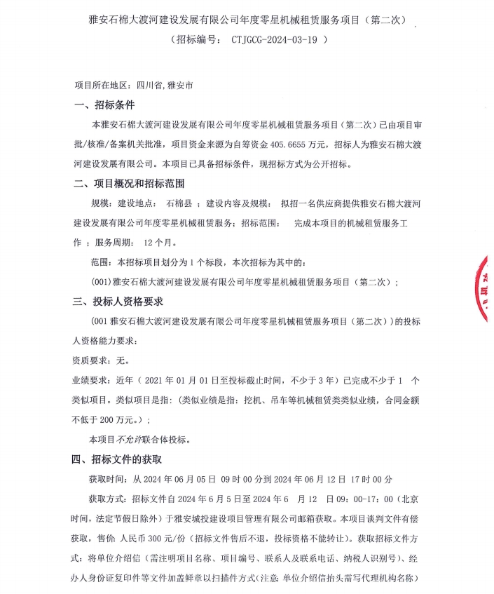 雅安石棉大渡河建設(shè)發(fā)展有限公司年度零星機(jī)械租賃服務(wù)項(xiàng)目(第二次)招標(biāo)公告