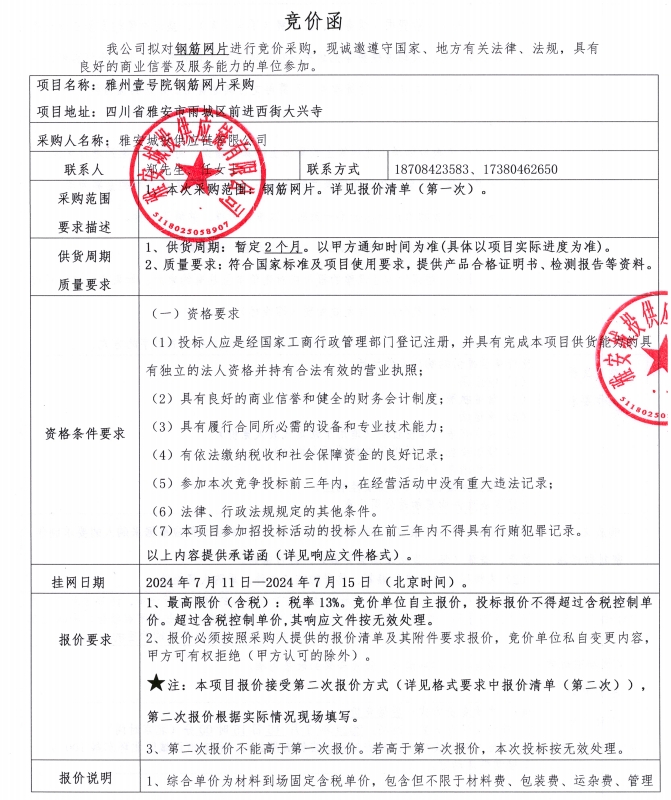雅州壹號院鋼筋網(wǎng)片采購競價(jià)公告