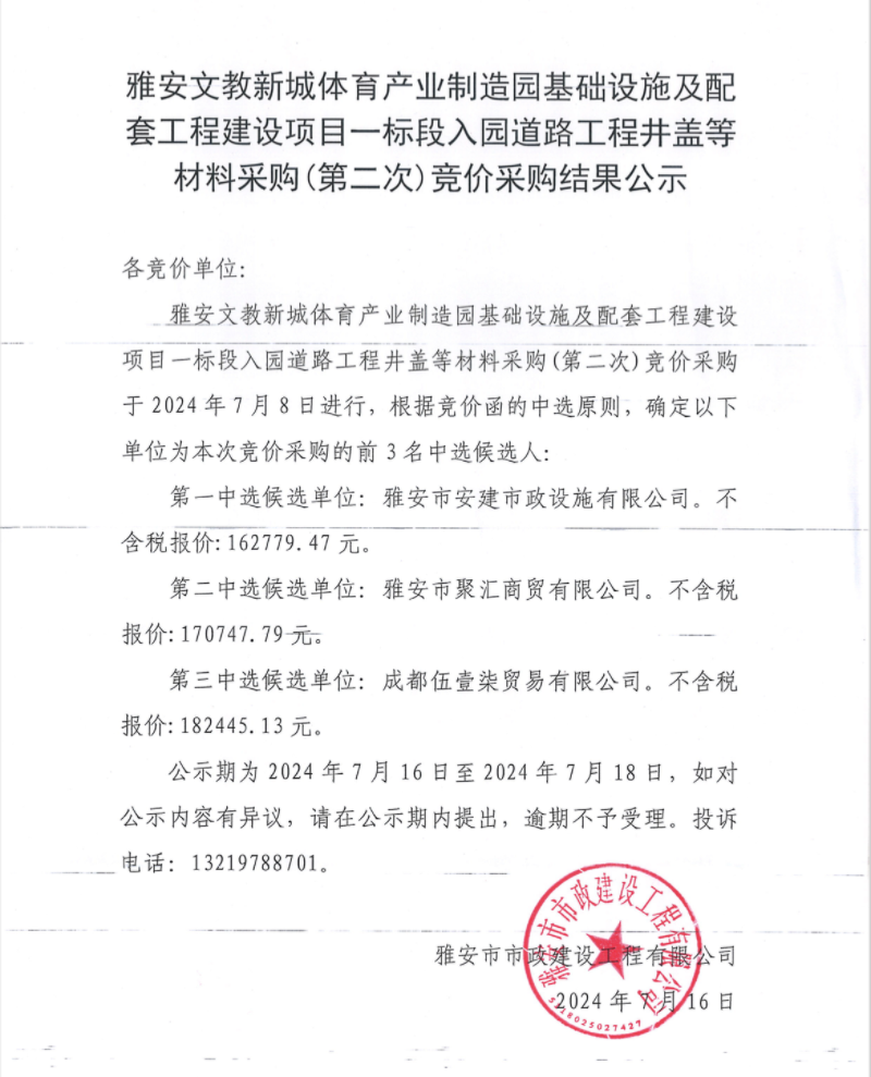雅安文教新城體育產(chǎn)業(yè)制造園基礎(chǔ)設(shè)施及配套工程建設(shè)項目一標段入園道路工程井蓋等材料采購(第二次)競價采購結(jié)果公示