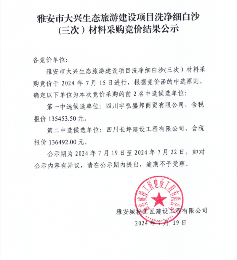 雅安市大興生態(tài)旅游建設(shè)項(xiàng)目洗凈細(xì)白沙(三次)材料采購競價(jià)結(jié)果公示