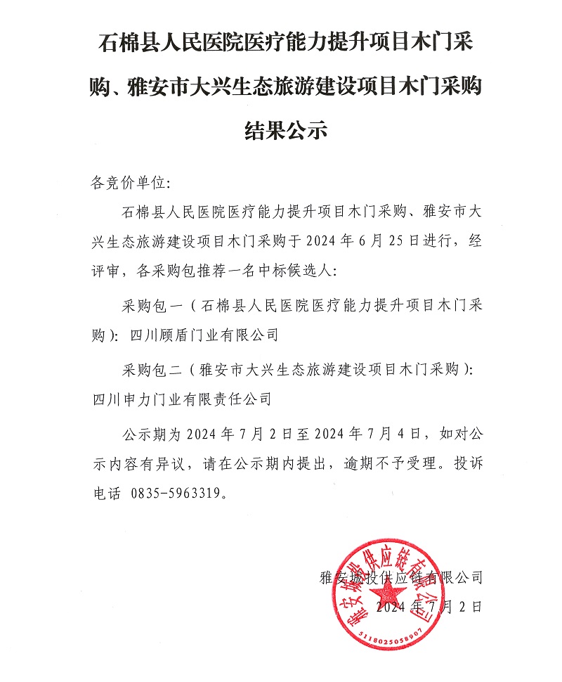 石棉縣人民醫(yī)院醫(yī)療能力提升項目木門采購、雅安市大興生態(tài)旅游建設(shè)項目木門采購結(jié)果公示