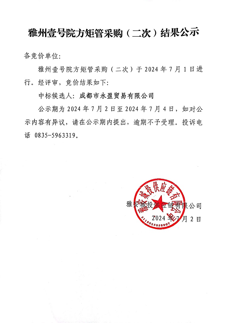 雅州壹號(hào)院方矩管采購(二次)結(jié)果公示