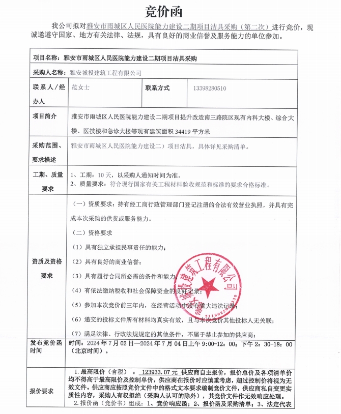 雅安市雨城區(qū)人民醫(yī)院能力建設二期項目潔具采購(第二次)競價公告