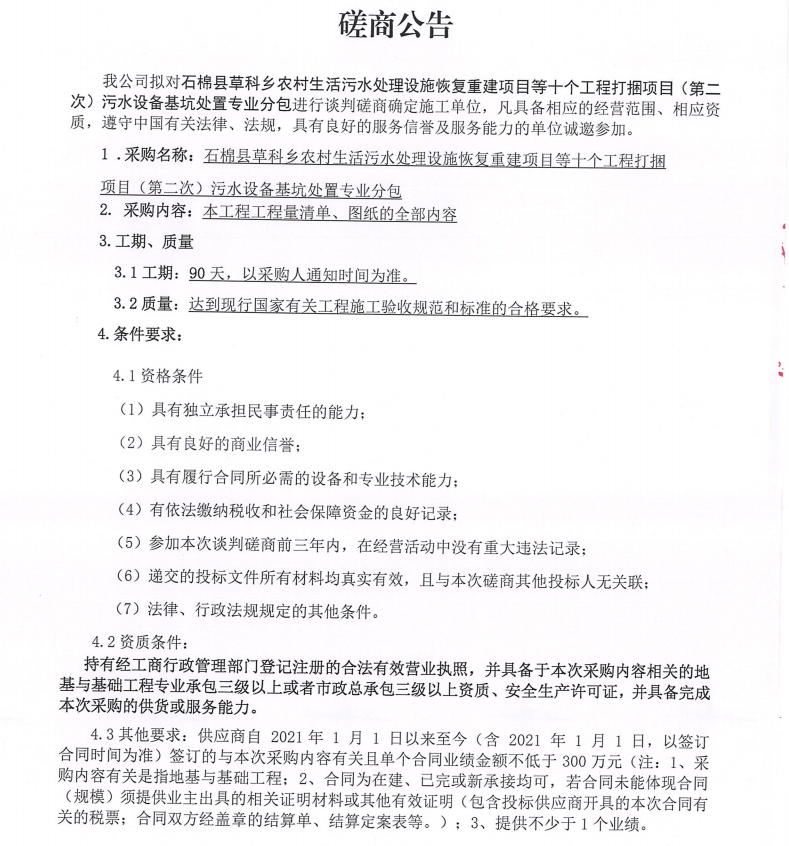 石棉縣草科鄉(xiāng)農(nóng)村生活污水處理設(shè)施恢復(fù)重建項(xiàng)目等十個工程打捆項(xiàng)目(第二次) 污水設(shè)備基坑處置專業(yè)分包采購談判磋商公告