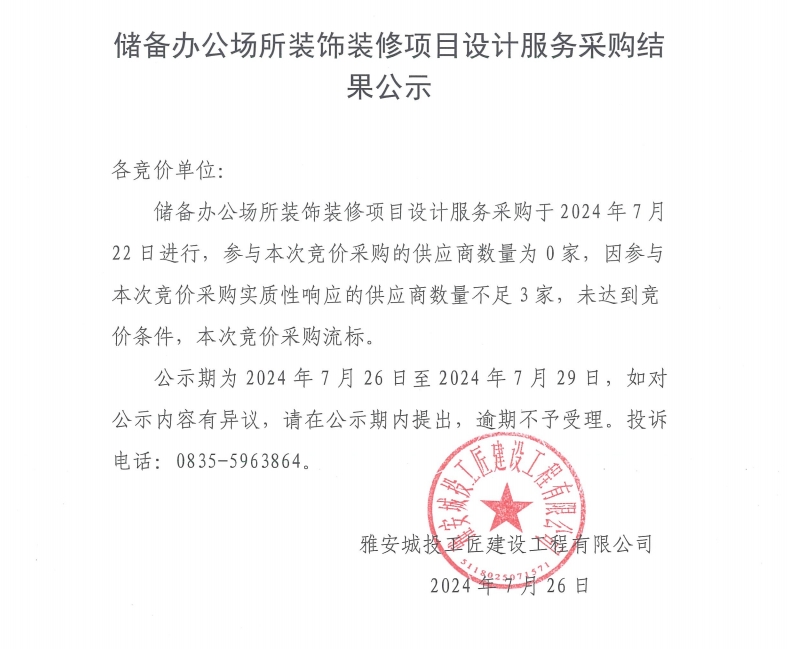 儲備辦公場所裝飾裝修項目設(shè)計服務采購結(jié)果公示