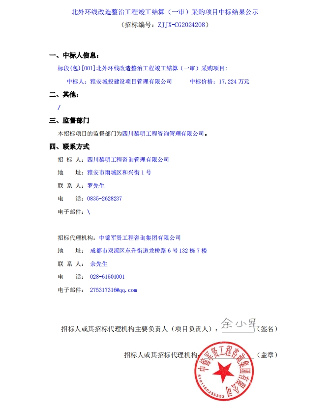 北外環(huán)線改造整治工程竣工結(jié)算(一審)采購(gòu)項(xiàng)目中標(biāo)結(jié)果公示