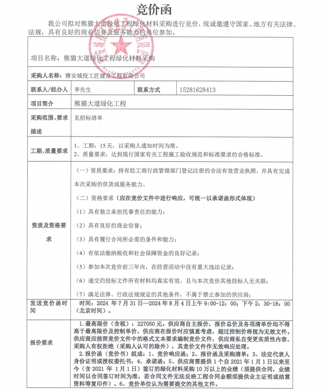 熊貓大道綠化工程綠化材料采購競價(jià)公告