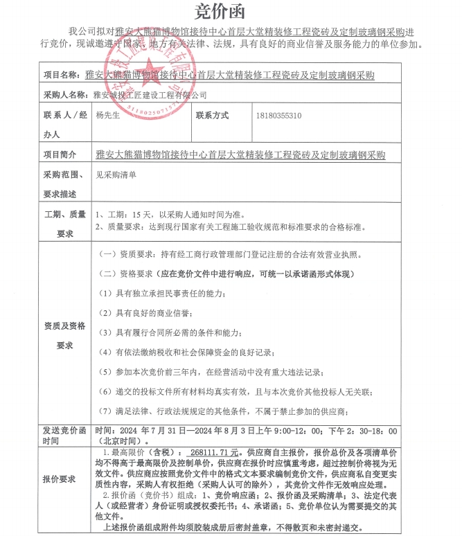 雅安大熊貓博物館接待中心首層大堂精裝修工程瓷磚及定制玻璃鋼采購競(jìng)價(jià)公告