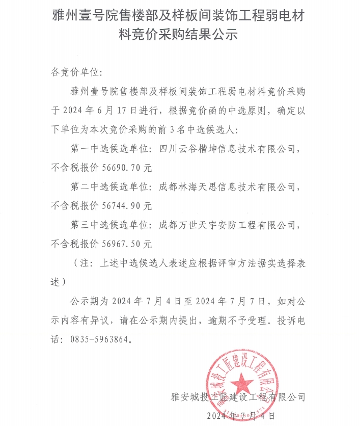 雅州壹號(hào)院售樓部及樣板間裝飾工程弱電材料競(jìng)價(jià)采購(gòu)結(jié)果公示