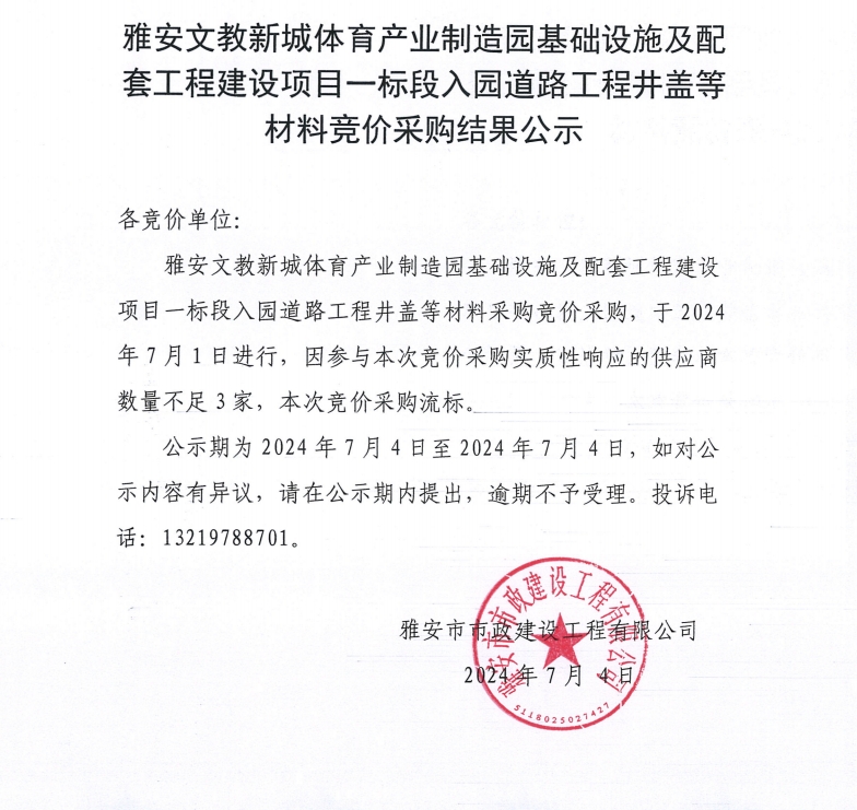 雅安文教新城體育產(chǎn)業(yè)制造園基礎(chǔ)設(shè)施及配套工程建設(shè)項(xiàng)目一標(biāo)段入園道路工程井蓋等材料競價(jià)采購結(jié)果公示