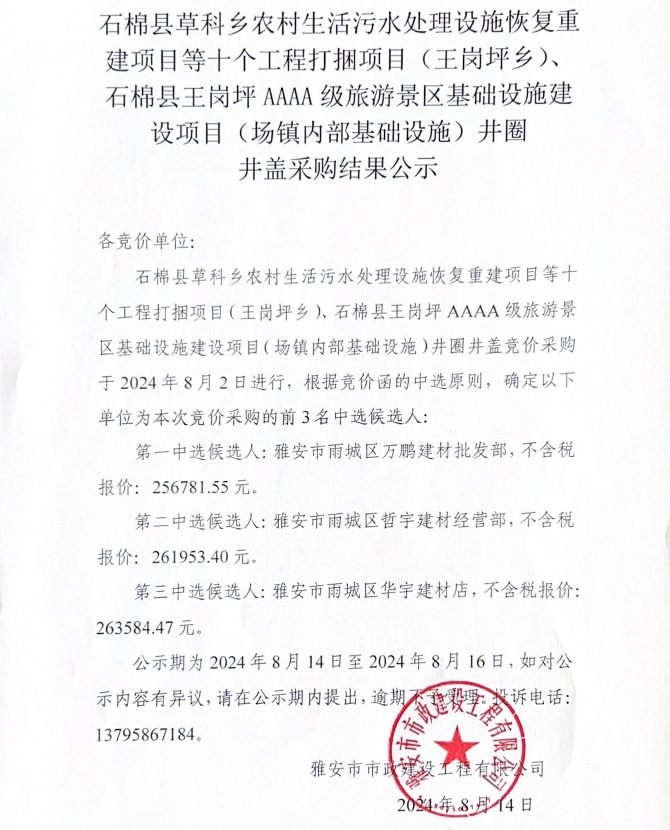 石棉縣草科鄉(xiāng)農(nóng)村生活污水處理設施恢復重建項目等十個工程打捆項目(王崗坪鄉(xiāng))、石棉縣王崗坪AAAA級旅游景區(qū)基礎設施建設項目(場鎮(zhèn)內(nèi)部基礎設施)井圈井蓋采購結(jié)果公示
