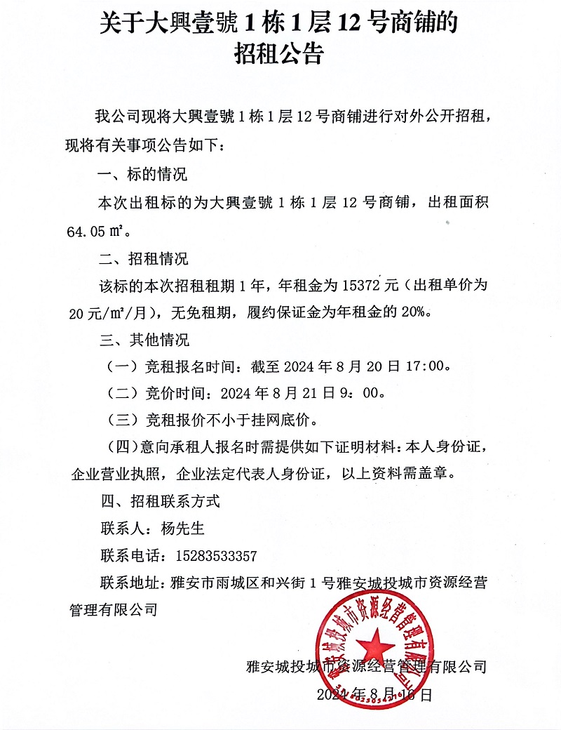 關(guān)于大興壹號(hào)1棟1層12號(hào)商鋪的招租公告
