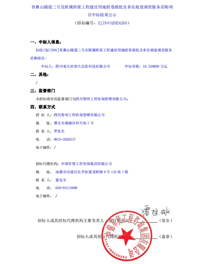 青鼻山隧道二號及附屬橋梁工程建設(shè)用地組卷報批及非農(nóng)痕跡調(diào)查服務(wù)采購項目中標(biāo)結(jié)果公示