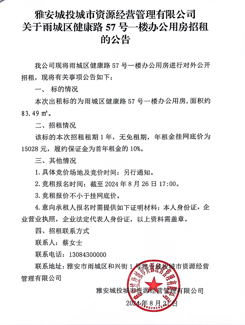 雅安城投城市資源經營管理有限公司關于雨城區(qū)健康路75號一樓辦公用房招租的公告