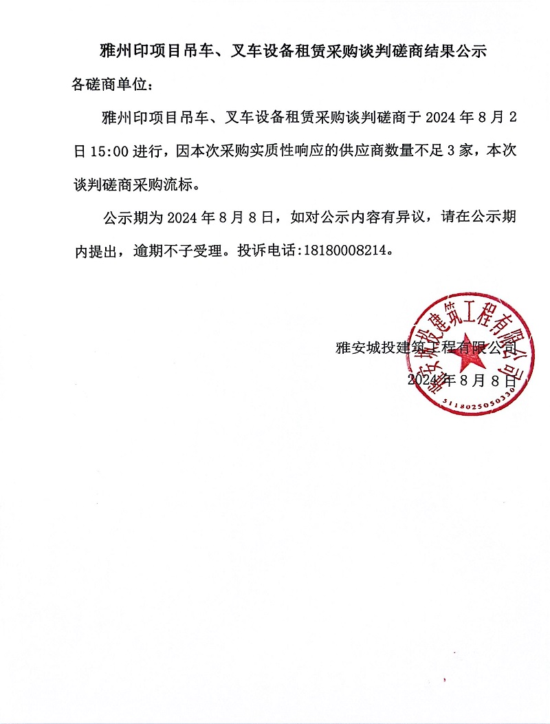 雅州印項(xiàng)目吊車、叉車設(shè)備租賃采購(gòu)談判磋商結(jié)果公示