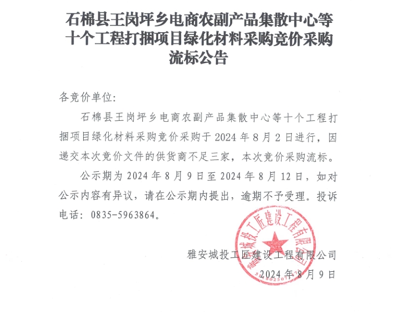 石棉縣王崗坪鄉(xiāng)電商農(nóng)副產(chǎn)品集散中心等十個工程打捆項(xiàng)目綠化材料采購競價采購流標(biāo)公告