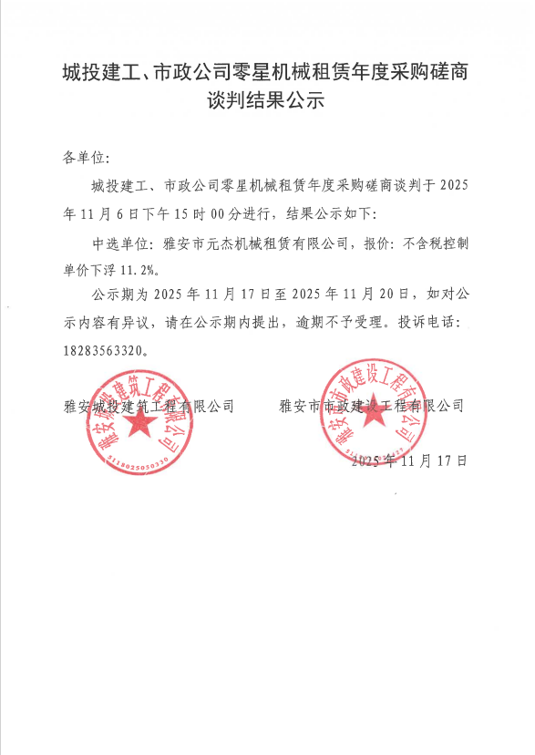 城投建工、市政公司零星機(jī)械租賃年度采購磋商談判結(jié)果公示