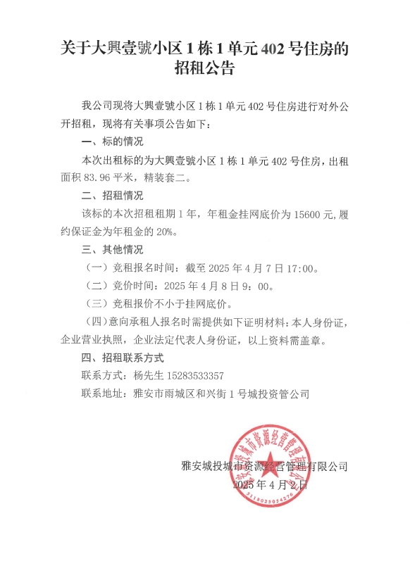 關于大興壹號小區(qū)1棟1單元402號住房的招租公告