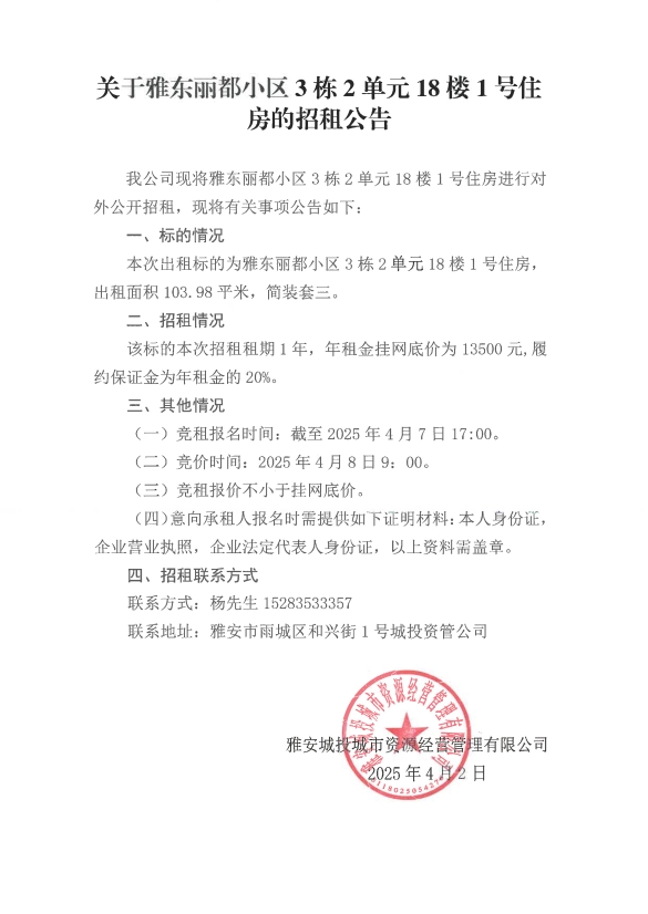 關于雅東麗都小區(qū)3棟2單元18樓1號住房的招租公告