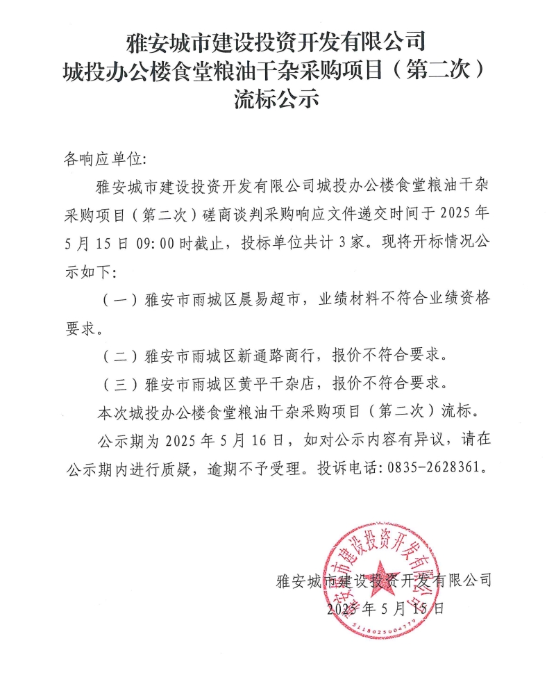 雅安城市建設(shè)投資開發(fā)有限公司城投辦公樓食堂糧油干雜采購項目(第二次)流標(biāo)公示