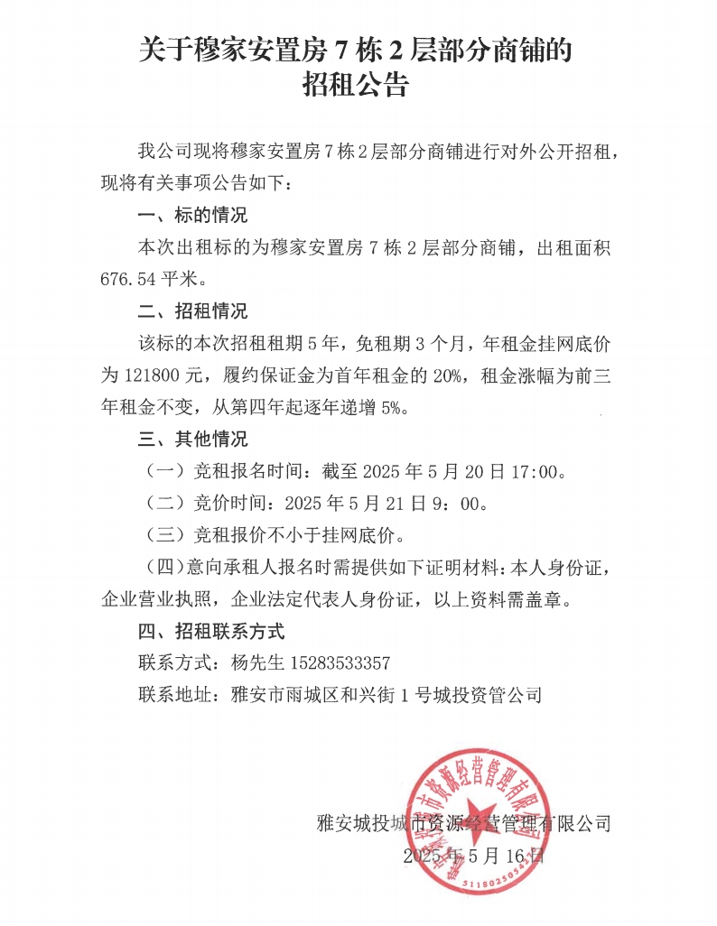 關(guān)于穆家安置房7棟2層部分商鋪的招租公告
