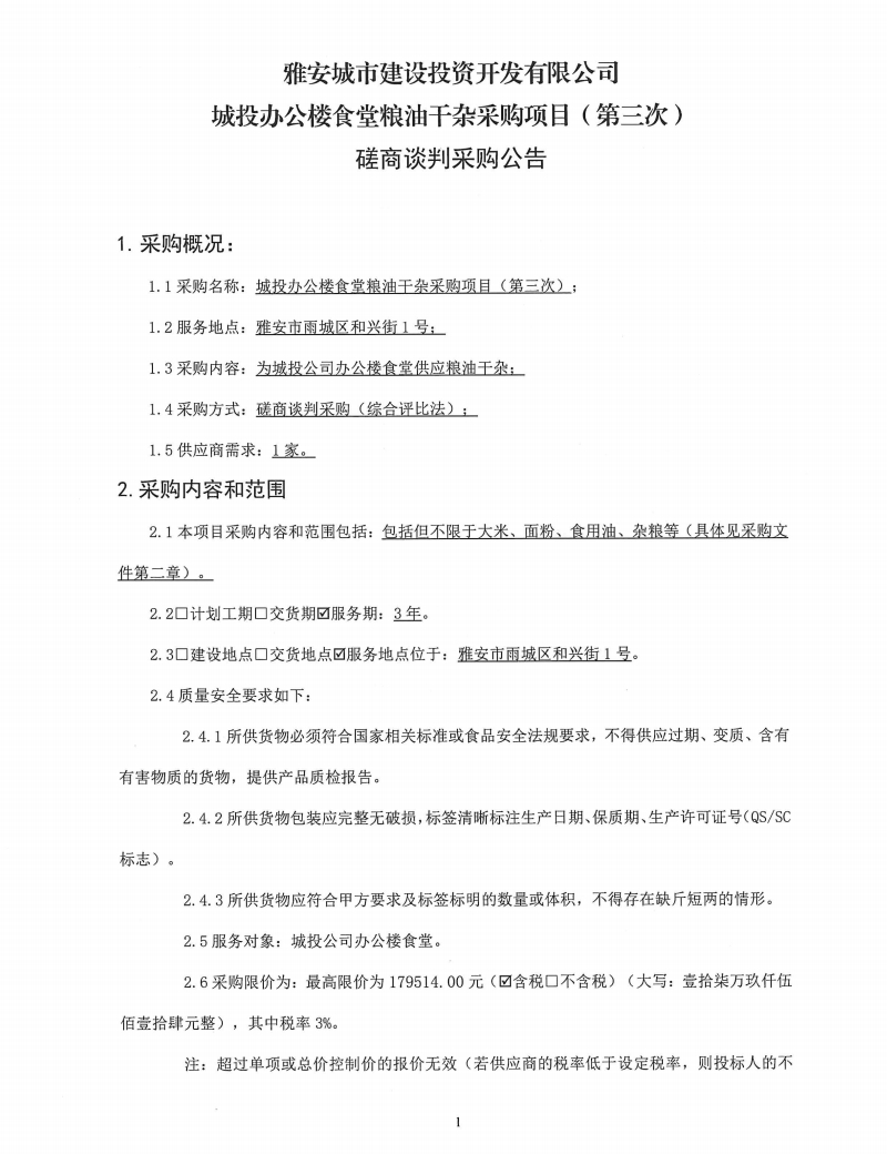 雅安城市建設(shè)投資開(kāi)發(fā)有限公司城投辦公樓食堂糧油干雜采購(gòu)項(xiàng)目(第三次)磋商談判采購(gòu)公告