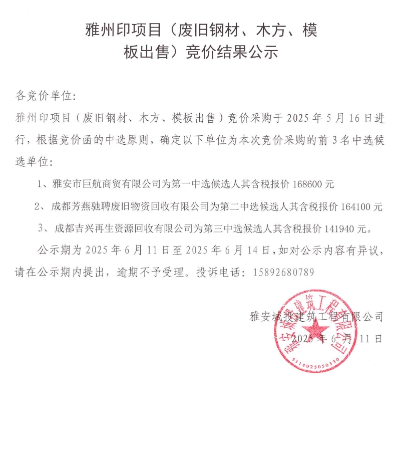 雅州印項目(廢舊鋼材、木方、模版出售)競價結(jié)果公示