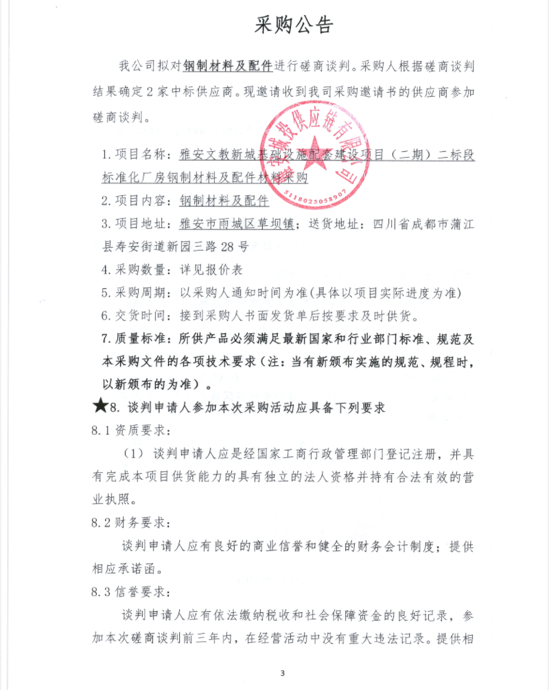 雅安文教新城基礎(chǔ)設(shè)施配套建設(shè)項目(二期)二標(biāo)段標(biāo)準(zhǔn)化廠房鋼制材料及配件材料采購公告