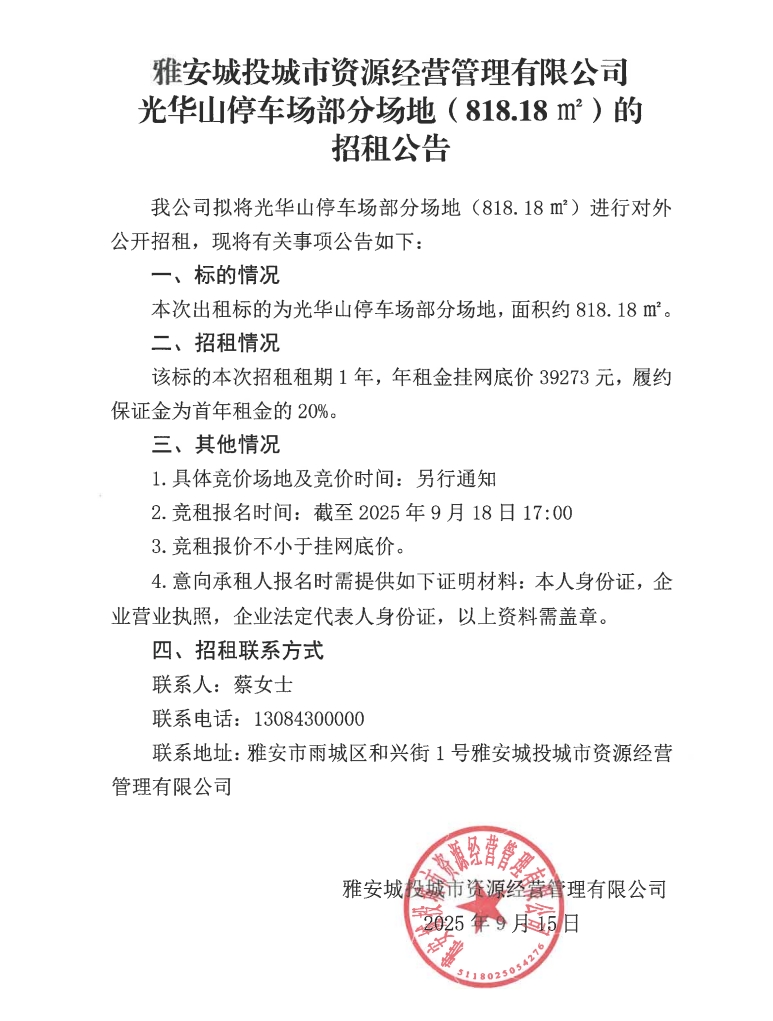 雅安城投城市資源經(jīng)營(yíng)管理有限公司光華山停車(chē)場(chǎng)部分場(chǎng)地(818.18㎡)的招租公告