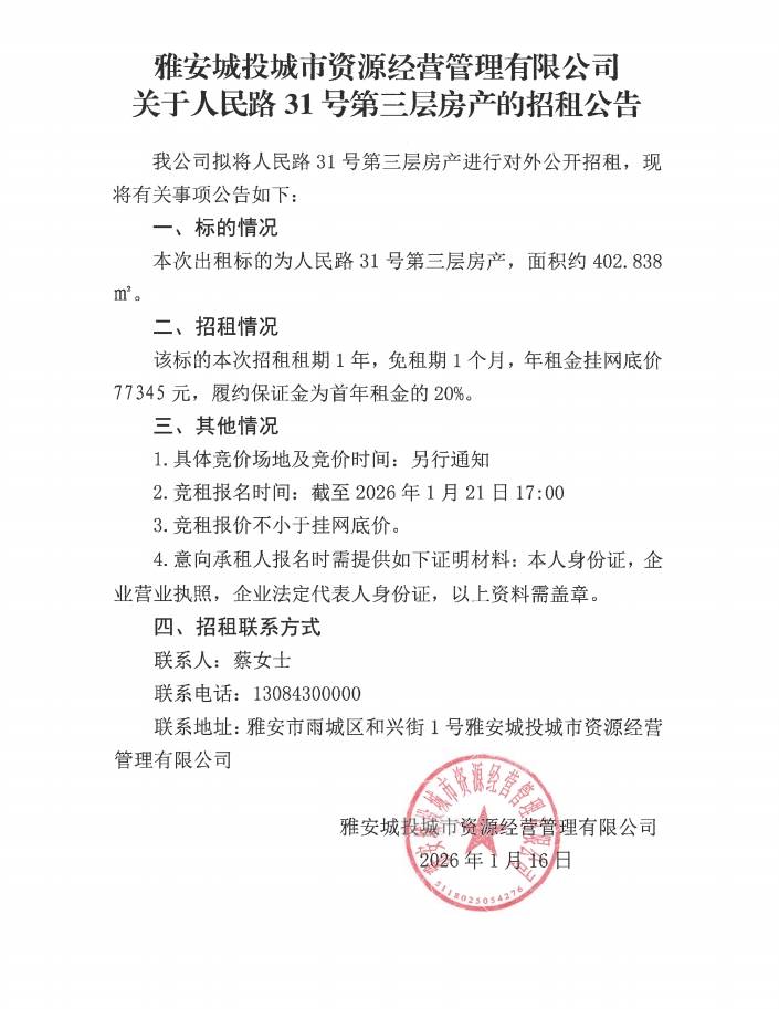 雅安城投城市資源經(jīng)營(yíng)管理有限公司關(guān)于人民路31號(hào)第三層房產(chǎn)的招租公告